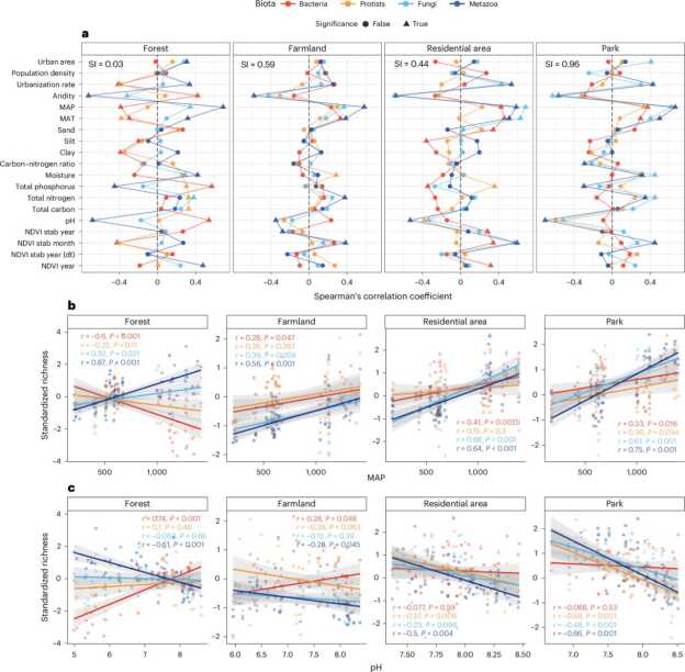 Soils in urban greenspaces often support higher microbial richness but with more homogenous communities than in natural ecosystems. However, it is not known how urbanization impacts the diversity and homogeneity of soil communities in urban greenspaces compared with other highly managed ecosystems such as farmlands. Here we conducted a continental-scale study spanning 13 cities and four land uses (city parks, residential areas, and adjacent forests and farmlands) in China. We found that urban ecosystems consistently support higher local soil bacterial, protist and fungal (but not metazoan) richness than farmlands and forests. This elevated richness was closely related to higher pH in urban ecosystem soils. Urban greenspaces also supported more homogenous soil communities than farmlands. The results indicate that urbanization drives biotic homogenization and increases synchronous responses to environmental stressors in urban greenspaces at a continental scale. Our findings have important implications for managing soil ecosystem resilience and functional diversity in cities of the future.
