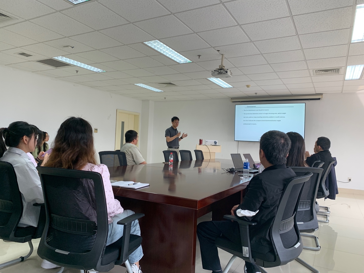 李鴻杰研究員目前任寧波大學(xué)農(nóng)產(chǎn)品質(zhì)量安全危害因子與風(fēng)險防控國家重點實驗室研究員、博導(dǎo)、安中講座教授、浙東學(xué)者。主要研究方向為昆蟲-共生微生物互作和協(xié)同進化。以第一/通訊作者發(fā)表PNAS ( 2 篇) 、Nature Communications 、Annual Review of Entomology、FEMS Microbiology Reviews、The ISME Journal等論文;主持國家自然科學(xué)基金(國家級青年人才項目、面上、青年項目)、浙江省杰出青年科學(xué)基金、國家重點研發(fā)項目子任務(wù)等項目;獲得第七屆中國生態(tài)學(xué)會青年科技獎等獎勵;研究成果得到國家基金委、美國能源部、《紐約時報》和《自然》等主流媒體專題報道。在本次報告中,李鴻杰研究員首先以科幻片《三體》中的故事為切入點,引人入勝地介紹了其對社會與自然,人與昆蟲的和諧共生關(guān)系的深刻理解。其次,李鴻杰研究員分三個方面介紹了自己的研究,分別是白蟻腸道微生物、培菌螞蟻和生物礦化現(xiàn)象。最后,李鴻杰研究員與參會師生就報告中的學(xué)術(shù)問題展開了熱烈的討論。